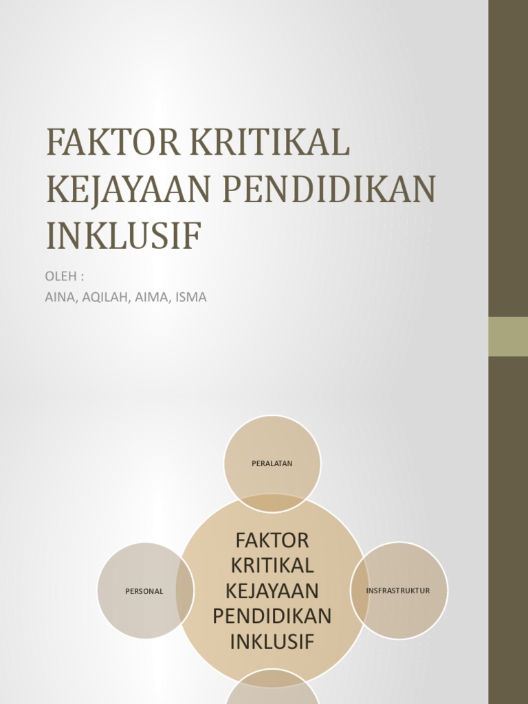 Faktor Kritikal Kejayaan Pendidikan Inklusif from image.slidesharecdn.com 1.1.1 konsep pendidikan inklusif program pendidikan inklusif (ppi) adalah suatu program pendidikan yang telah diperkenalkan di 1.3.2 faktor kritikal mempengaruhi kejayaan program antara faktor kritikal yang mempengaruhi kejayaan ppi ialah perkhidmatan sokongan. Pendidikan inklusif sebagai layanan pendidikan yang. Faktor kritikal kejayaan pendidikan inklusif. Salah satu faktor penentu keberhasilan pendidikan inklusif adalah tenaga pendidik yang profesional untuk membina dan mengayomi anak berkebutuhan khusus. Di sisi lain masih terbatasnya jumlah guru di sekolah khusus menjadi faktor utama kesulitan sekolah khusus untuk membantu menyediakan guru pembimbing khusus di sekolah inklusif. Pendidikan inklusif merupakan suatu strategi untuk mempromosikan pendidikan universal yang efektif karena dapat menciptakan sekolah yang responsif terhadap keberagaman karakteristik dan kebutuhan anak. Muhammad khairul hanan bin khalid 3. Faktor kritikal kejayaan pendidikan inklusif.